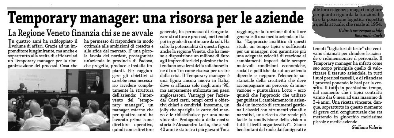 E’ una piccola favola del Nordest, protagonista un’azienda in provincia di Padova, che progetta, produce e installa impianti, tra le prime tre aziende del suo settore nel panorama mondiale. Una realtà che lavora in un mercato in espansione, con una forte vocazione all’esportazione, e che offriva la possibilità all’imprenditore di pensare in grande e di essere ambiziosi. Ma per raggiungere gli obiettivi si sarebbe reso necessario rivedere completamente la struttura dell’azienda. L’intervento del ‘temporary manager’, un manager esterno che per quattro anni ha lavorato prima come direttore operativo, quindi come direttore generale, hapermesso di riorganizzare struttura e processi, mettendoli poi in grado di continuare da soli.